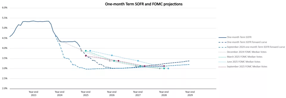 On the other hand, forward curves are derived from financial contracts that price and/or settle based on future settings for an underlying index. An interest rate forward curve for a market like SOFR, is at a discrete moment in time a graphical representation of the market clearing forward rates for that index. Unlike the Fed dot plot, the forward curve is live and will shift throughout the day as market forces move, especially at points farther along the curve.