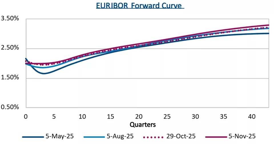 With inflation close to target and near-term growth risks easing, policymakers see little urgency to adjust rates further. Market pricing still implies only a modest probability of a 25 bp cut by mid-2026, reflecting investor caution around Eurozone growth, potential financial stress, or renewed euro strength.