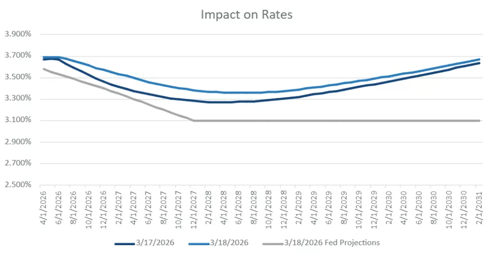 On Wednesday, March 18, 2026, the Federal Open Market Committee (FOMC) voted to hold the federal funds rate unchanged at a range of 3.50%–3.75%. All members supported the decision except Governor Miran, who dissented in favor of a 25 basis point (bp) cut. The Committee emphasized increased uncertainty in the economic outlook, citing recent developments in the Middle East and their unclear implications for the U.S. economy. While economic activity continues to expand at a solid pace and unemployment remains stable, the housing sector remains a weak point.