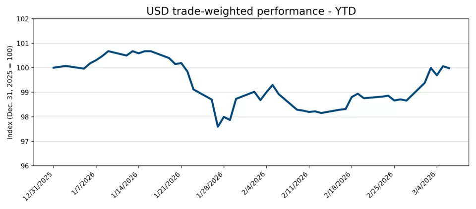At the same time, the US dollar has strengthened on its safe-haven status amid geopolitical uncertainty. As shown in the chart below, USD Trade-Weighted Index, indexed to 100 at 1 January 2026, the dollar’s early-year softness has given way to a more pronounced move higher in recent sessions, reflecting renewed demand for safe-haven assets. Proving, again, that concerns over debasement of USD were overblown, and in times of risk off, buying USD is considered the safest move.