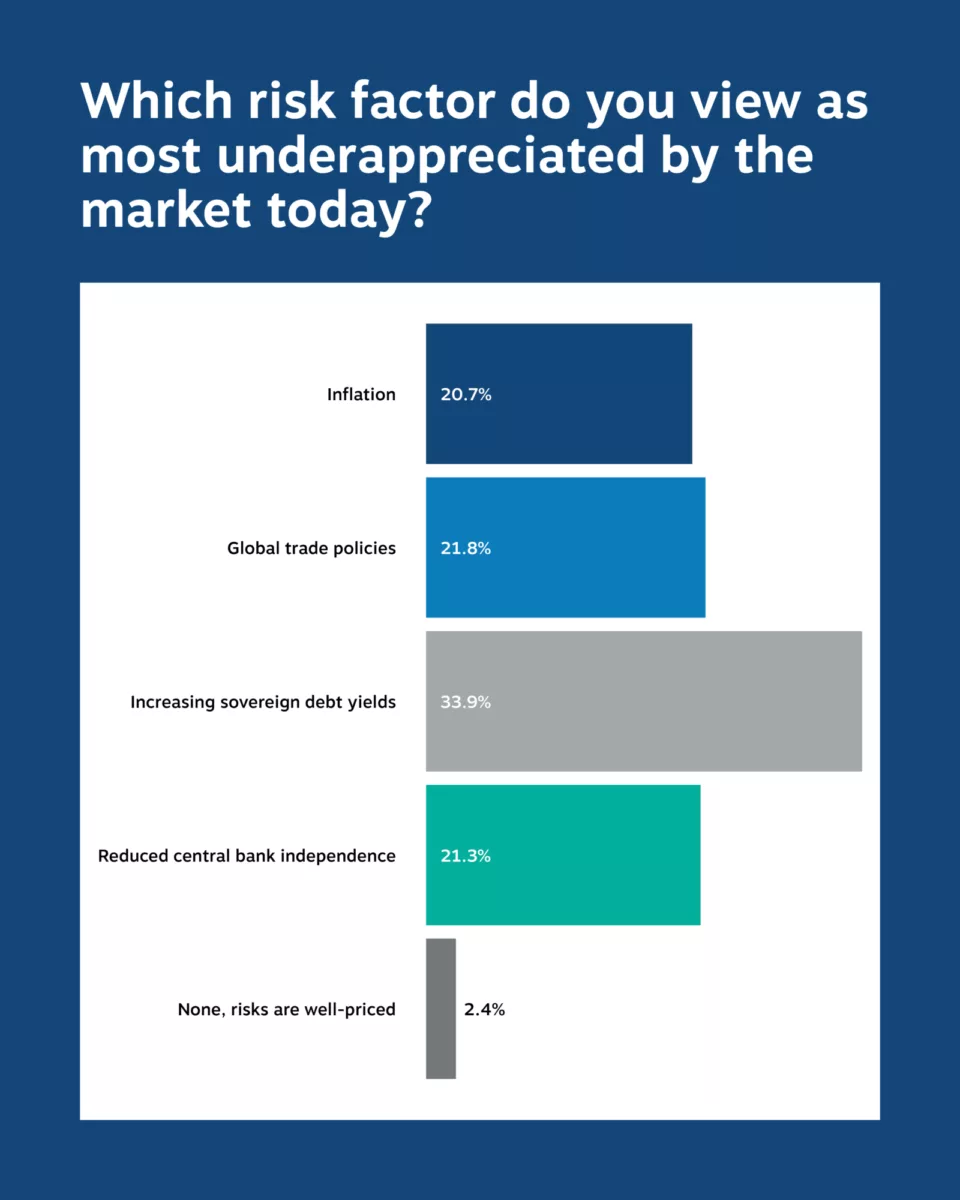 Don’t take our word for it. On our virtual event, we asked our audience which risk factor they view as most underappreciated in the market. Below are their responses showing “Increasing sovereign debt yields” having the most votes from those polled.