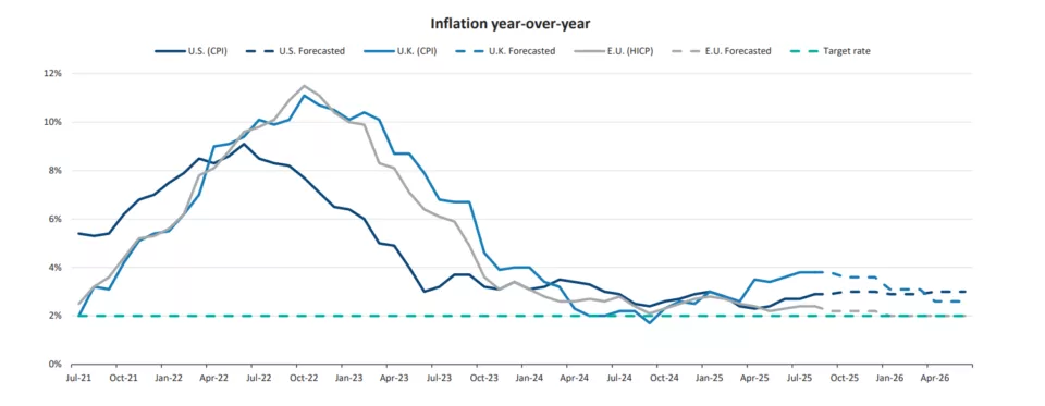 Source: U.S. Bureau of Labor Statistics, Eurostat, ONS, and Bloomberg, revised September 23, 2025